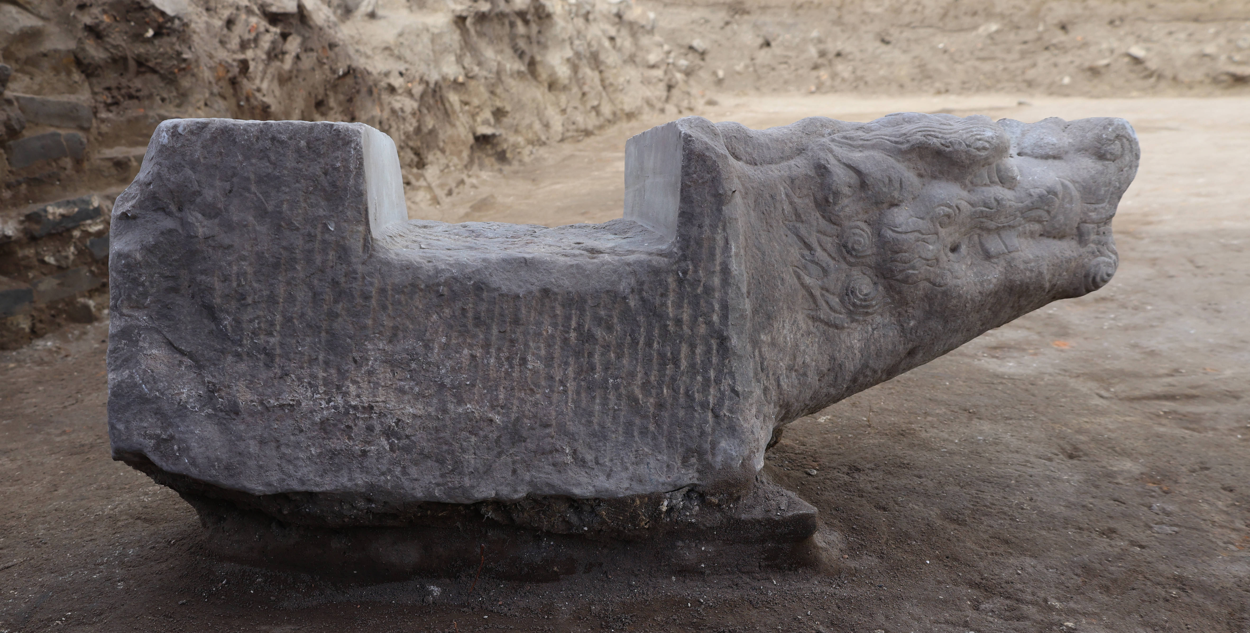 图为发掘出土的石螭首。新华社发据了解,本年度发掘出土遗物主要出自基址上的倒塌堆积,出土遗物多为建筑材料,包括陶板瓦、筒瓦、瓦当、滴水、脊兽、砖,以及石螭首、栏杆构件等。陶建筑材料多有琉璃器,以绿色琉璃为多。瓦当、滴水纹饰以龙纹为主,凤纹为次。其他遗物中可见大量残塑件,应是建筑或佛像上的装饰品。